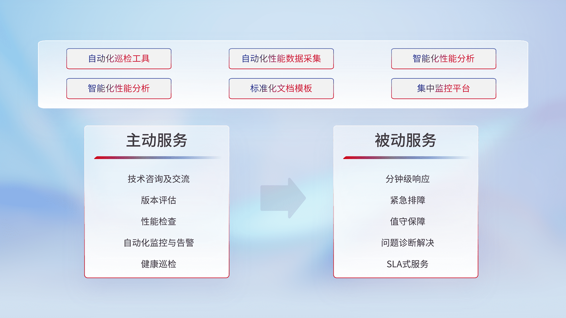 智能化工具和标准化文档,,,,保障服务质量,,提供主动服务(包含技术咨询、、、版本评估、、、性能检查、、、自动化监控与告警、、、健康巡检)和被动服务包含(分钟级响应、、紧急排障、、值守保障、、、问题诊断解决、、、SLA服务)。。。